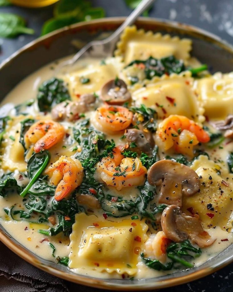 🥣 Ravioli with Seafood, Spinach & Mushrooms in Garlic Cream Sauce