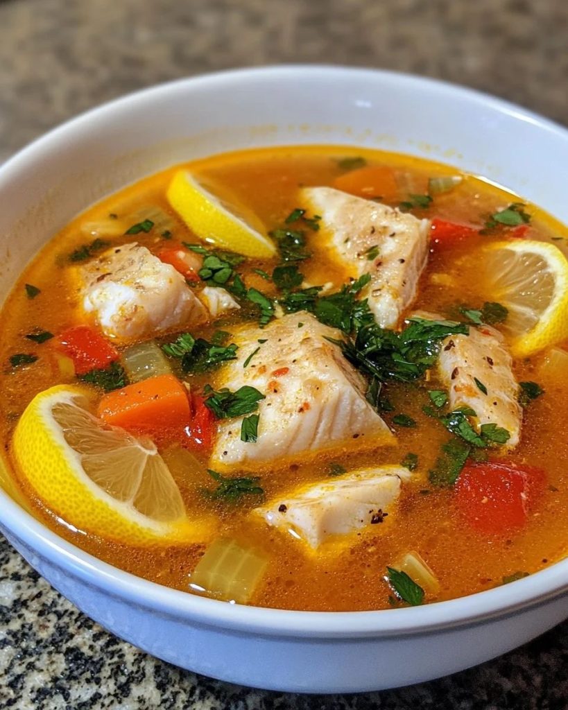 Carefully add the fish chunks into the simmering soup. Cook gently for 7–10 minutes, or until the fish becomes tender and flakes easily with a fork. Avoid stirring too much to prevent breaking the fish apart. - Finish with lemon and herbs: