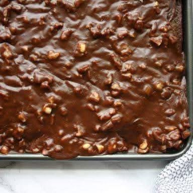 9. Finish the Cake – Pour the warm frosting over the marshmallow layer. Use a spatula to spread it evenly, letting it seep into the marshmallows for that signature mud-like texture.