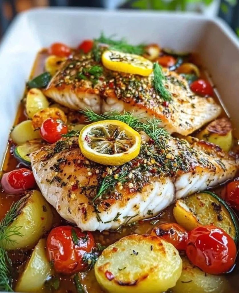 Full Recipe: Mediterranean-Style Baked White Fish with Lemon-Herb Potatoes and Vegetables