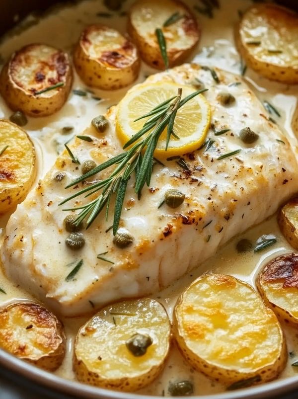 Prepare to discover your new favorite weeknight dinnerâa stunning, yet surprisingly simple cod recipe that delivers restaurant-quality flavor. This dish features a perfectly pan-seared cod fillet bathed in a bright, luscious lemon-caper cream sauce. Surrounding this centerpiece are golden-brown roasted potatoes, their crispy edges soaking up the velvety sauce. Garnishings of fresh rosemary and a delicate lemon slice elevate the presentation, making this meal not just food, but an experience. The combination of flaky fish, tangy capers, rich cream, and zesty lemon creates a flavor profile that is truly irresistible, striking the perfect balance between richness and freshness. Itâs fast, elegant, and guaranteed to impress, earning its spot as a high-end yet easy seafood recipe.