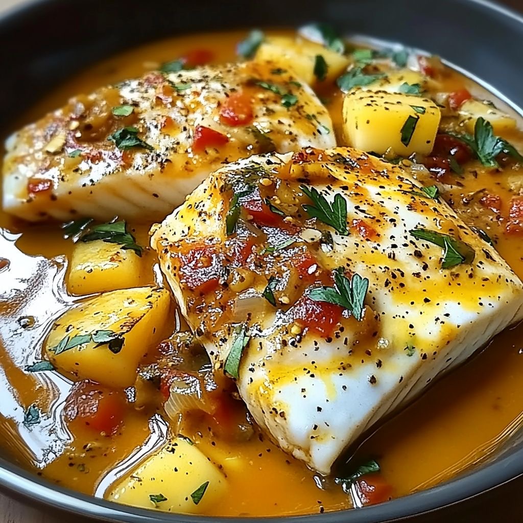 Prepare to elevate your weeknight dinner with a dish that is as **visually stunning** as it is **unforgettable** on the palate. Our **Braised White Fish**—featuring succulent, flaky fillets—is nestled in a **vibrant, aromatic broth** that captures the essence of Mediterranean sunshine. Forget boring dinners; this recipe delivers **restaurant-quality flavor** with the ease of a **simple one-pan meal**. The **tender fish**, sweet **bursts of tomato**, and creamy chunks of **golden potato** are enveloped in a fragrant sauce kissed by **saffron** and **smoky paprika**. It’s **healthy, flavorful**, and truly **irresistible**. This is the **perfect recipe** for the discerning home cook looking for **maximum impact** with **minimum fuss**.
