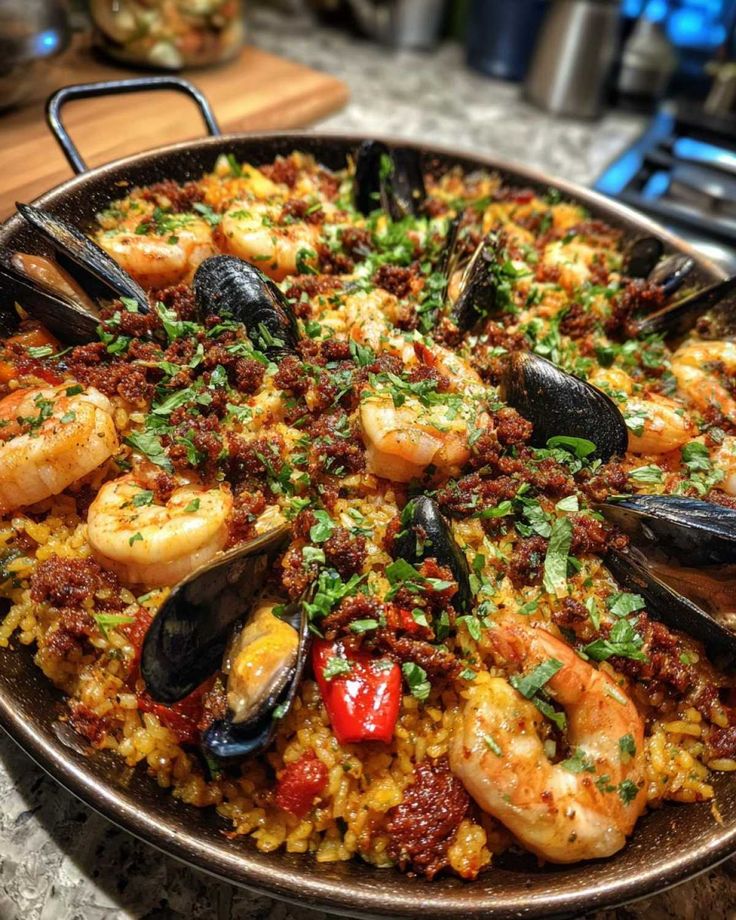 This Seafood Paella with Chorizo proves that gourmet flavor doesn’t have to be complicated. With one pan, carefully chosen ingredients, and clear steps, you’ll create a dish that is vibrant, savory, and unforgettable. Its bold colors, intoxicating aroma, and incredible taste make it a guaranteed showstopper — the kind of recipe that keeps guests talking long after the meal ends.