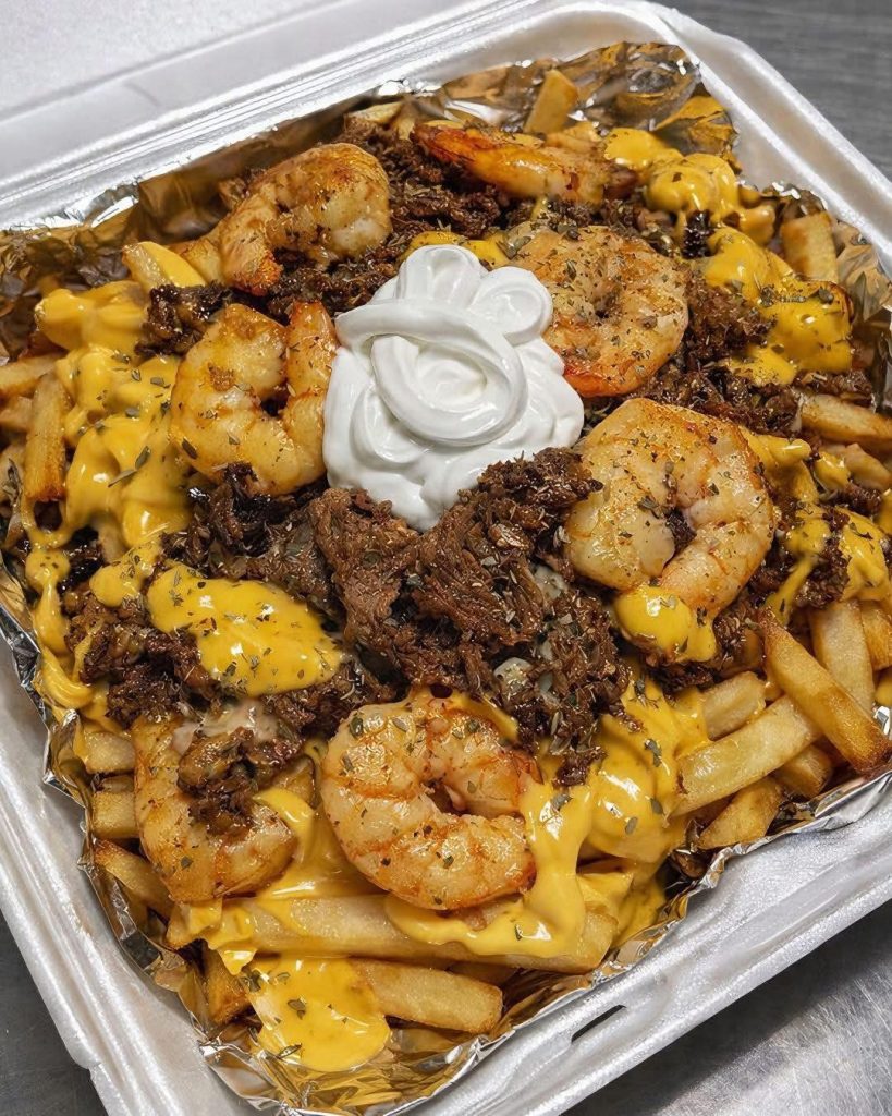 Line a serving tray with foil. Place your golden fries down first, followed by a heavy drizzle of warm nacho cheese. Distribute the steak and shrimp evenly, ensuring every fry has a piece of protein attached.