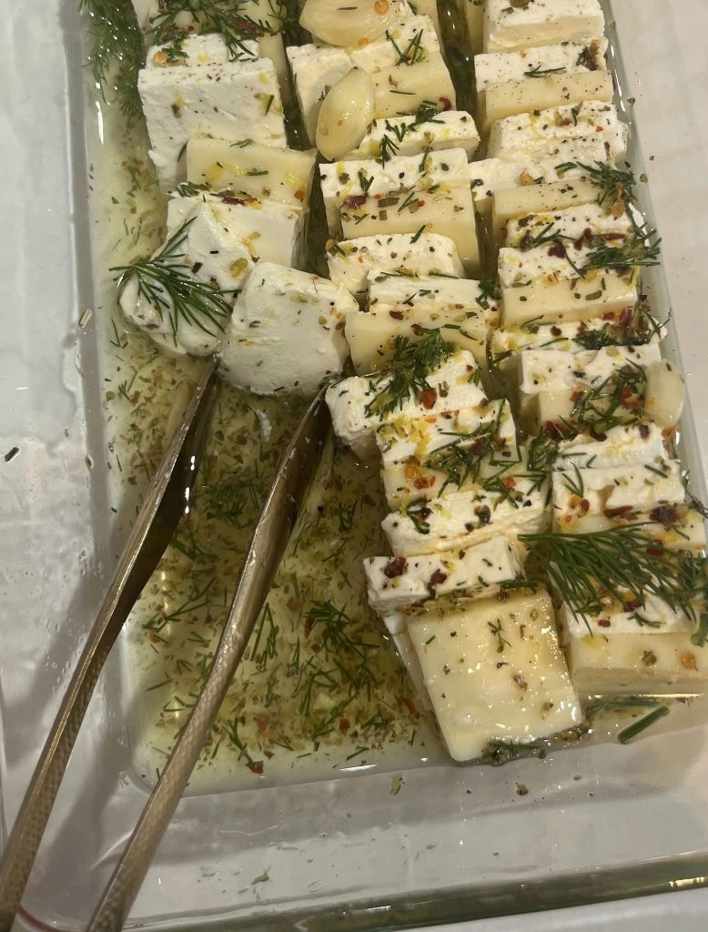 1. Prepare the Cheese: Carefully slice your feta and goat cheese into uniform rectangular blocks. Consistency ensures that every bite is equally infused. Arrange them in a decorative glass dish.