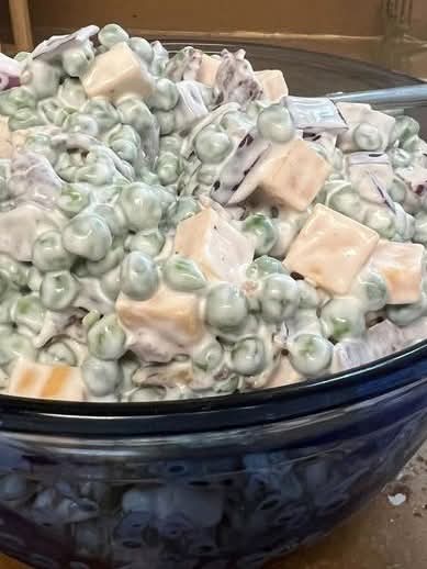 brings together tender peas, savory bacon, sharp cheddar cheese, and a perfectly balanced creamy dressing.